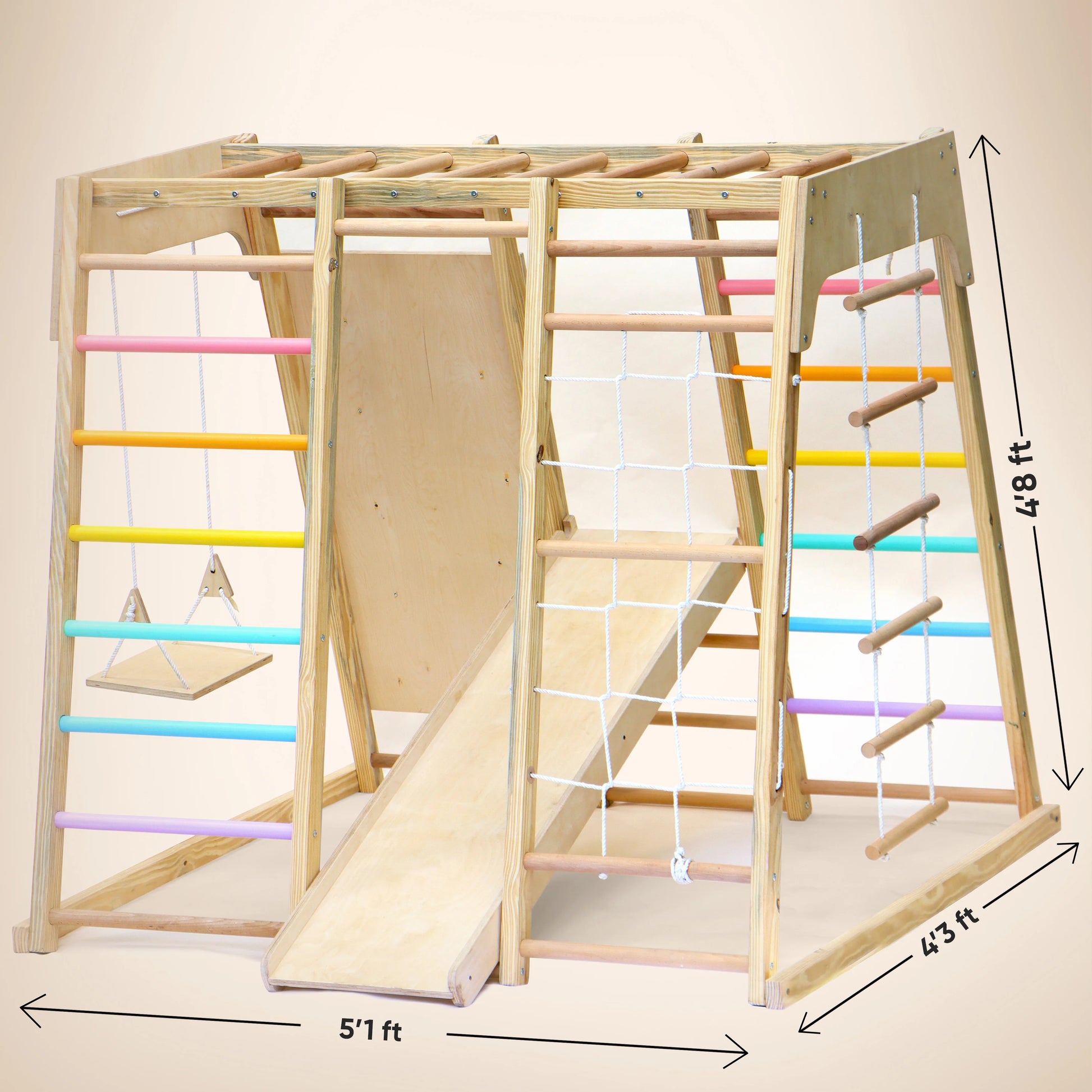 • 7-in-1 Jungle Gym ( slide, swing, monkey bar, rope climbing, rock climbing and wooden ladder)