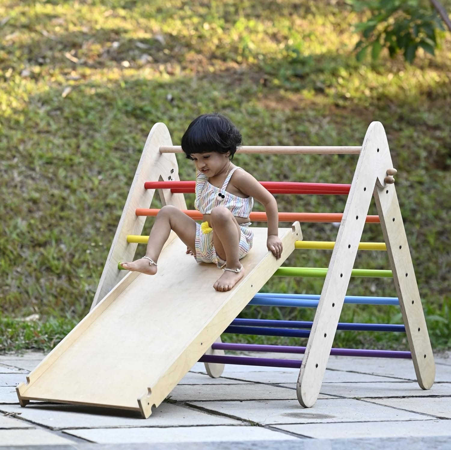 • The Pikler triangle with slider encourages children to explore their physical capabilities, experiment with different ways of moving, and develop confidence and resilience as they overcome physical challenges.