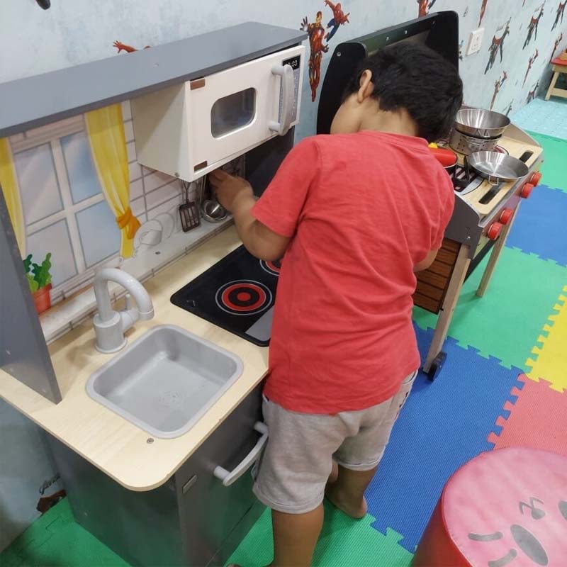 • Includes a pretend sink, oven, storage cupboards, a microwave, cooking utensils, imaginary windows and shelves.